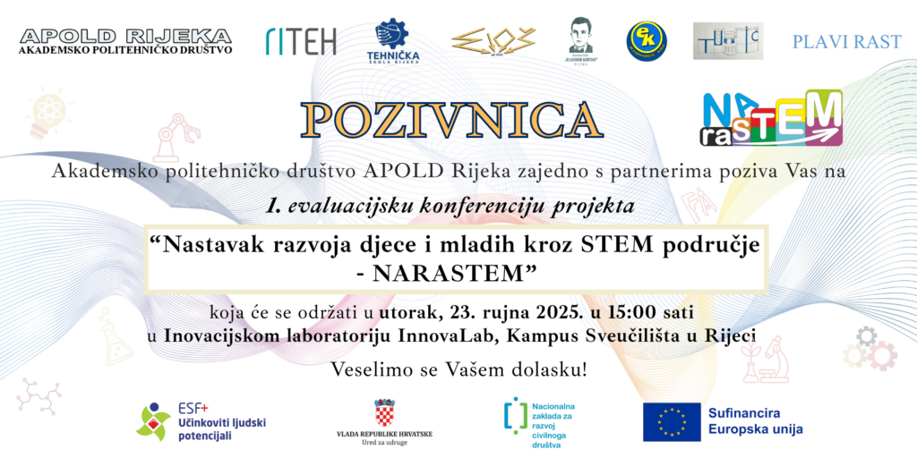 Akademsko politehničko društvo APOLD Rijeka zajedno s partnerima, s veseljem vas poziva na 1. evaluacijsku konferenciju projekta „Nastavak razvoja djece i mladih kroz STEM područje – NARASTEM“.